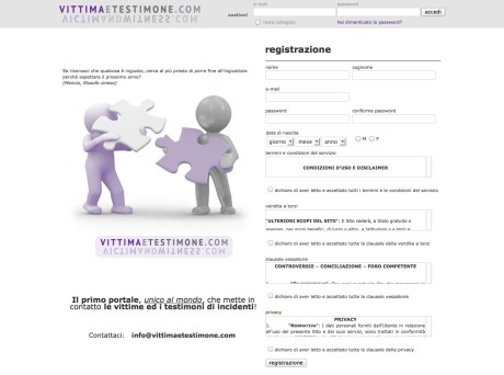 Si tratta del sito Vittima e Testimone, uno strumento al servizio dei cittadini, delle forze di polizia ma anche delle assicurazioni, nato con l’intento di mettere in comunicazione la vittima di un incidente stradale (con fuga del colpevole) e un eventuale testimone. Il web è pieno di blog e annunci di vittime alla disperata ricerca di qualcuno che possa aver assistito a un incidente. Da questo nasce l’idea del sito.