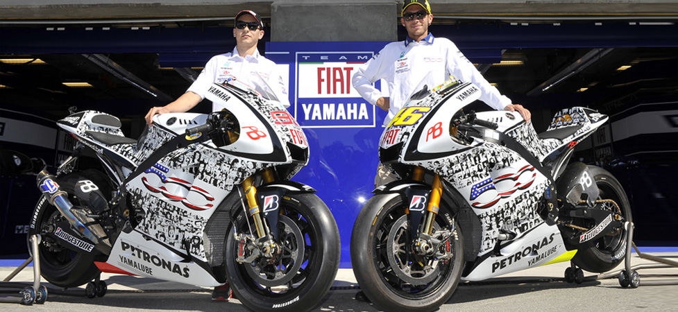 Le livree dello moto di Valentino Rossi e di Jorge Lorenzo, allora nel FIAT Yamaha Team, sono state realizzate con le immagini di 500 fan, inviate al sito realizzato per l’occasione (qui) per celebrare il lancio del famoso cinquino nel mercato statunitense.