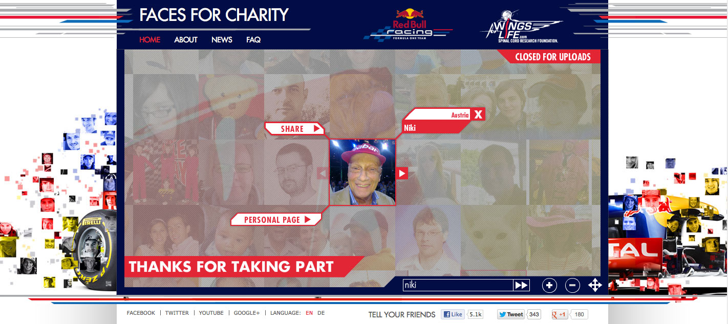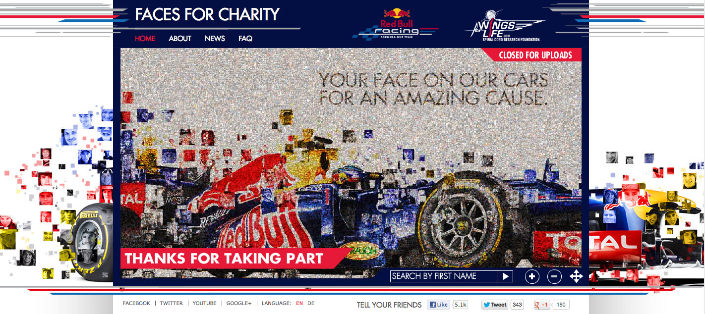 Con una donazione di 15 euro, i tifosi di tutto il mondo hanno avuto la possibilità di caricare una propria immagine nel sito di Faces for Charity (qui) e vederla entrare a far parte dell’immenso collage che ha colorato per tutto il weekend di gara le monoposto dei campioni della Red Bull Racing.