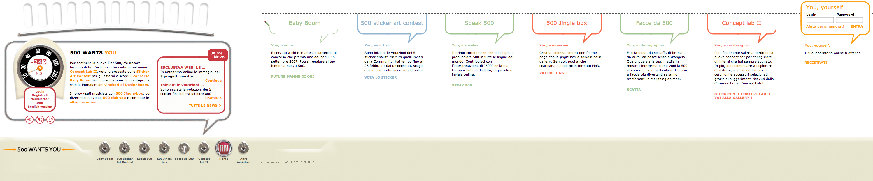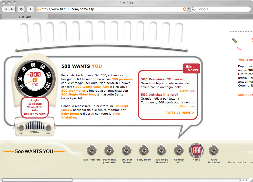 500 wants you è stata infatti una delle prime azioni di marketing collaborativo online. Per realizzare e promuovere l’auto del rilancio, FIAT ha voluto utilizzare il web e il dialogo con i consumatori, rappresentando una delle più alte espressioni del Web 2.0. E tutto ben prima dell’avvento dei social network che non esistevano ancora: agli inizi del 2006 Facebook era prerogativa di alcune Università americane, YouTube era agli albori e non aveva ancora un anno di vita e le aziende non pensavano ancora che l’opinione dei consumatori online fosse degna di nota, ma non per FIAT.