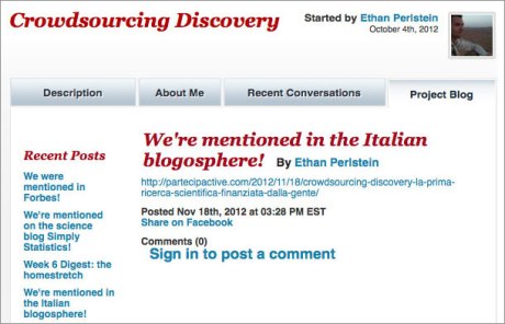 Magari Perlstein e soci hanno sbagliato a dare il titolo al progetto, ma non hanno sbagliato nulla nei confronti dello spirito dei progetti partecipativi: è stato richiesto aiuto alla gente e grazie alla rete, la gente potrà accedere agli aggiornamenti sul progetto di ricerca, in tmpo reale. Tutto verrà documentato e messo a disposizione di chiunque nel sito dedicato al progetto.