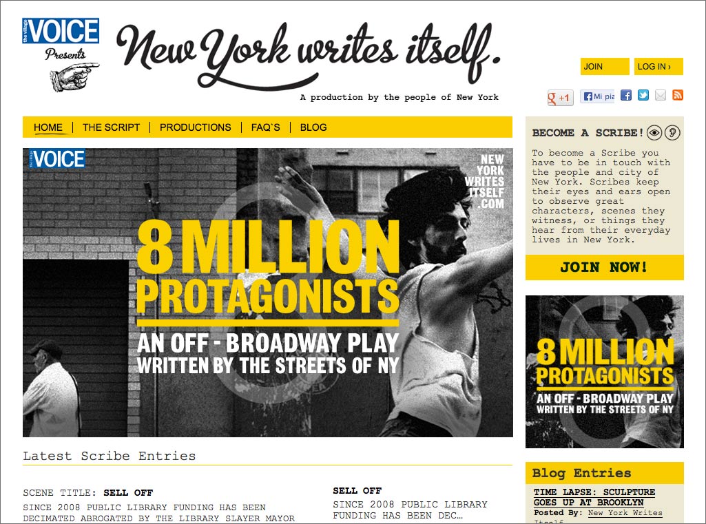 Da questi presupposti è nato il website New York Write Itself, che ha dato vita in modo partecipativo a 8 Million Protagonists, una commedia off-Broadway scritta da chi vive le strade di New York City.
