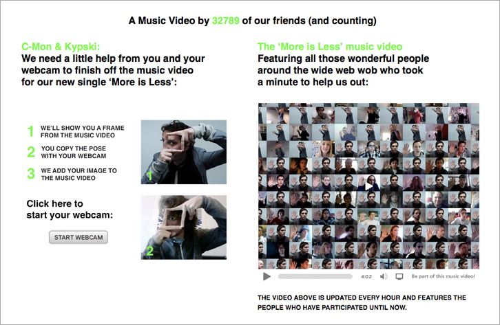Chiaro no? All’inizio il video era composto solo dalle pose dei 4 componenti della band. Via via che gli utenti copiavano e le registravano via webcam grazie a un tool nel sito del progetto, il videoclip si arricchiva della partecipazione di migliaia di persone creando versioni sempre più aggiornate. Una nuova ogni ora e un risultato corale sempre più spettacolare. Sono d’accordo con gli ideatori che questo è:
