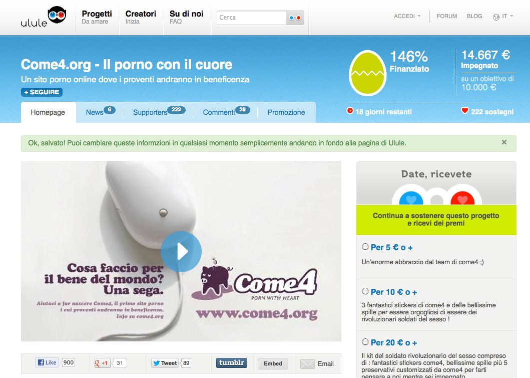 Da questo ragionamento è nata l’idea un po’ pazza e un po’ irriverente di realizzare Come4.org, il primo sito porno con contenuti user generated che devolve in beneficenza i proventi raccolti.